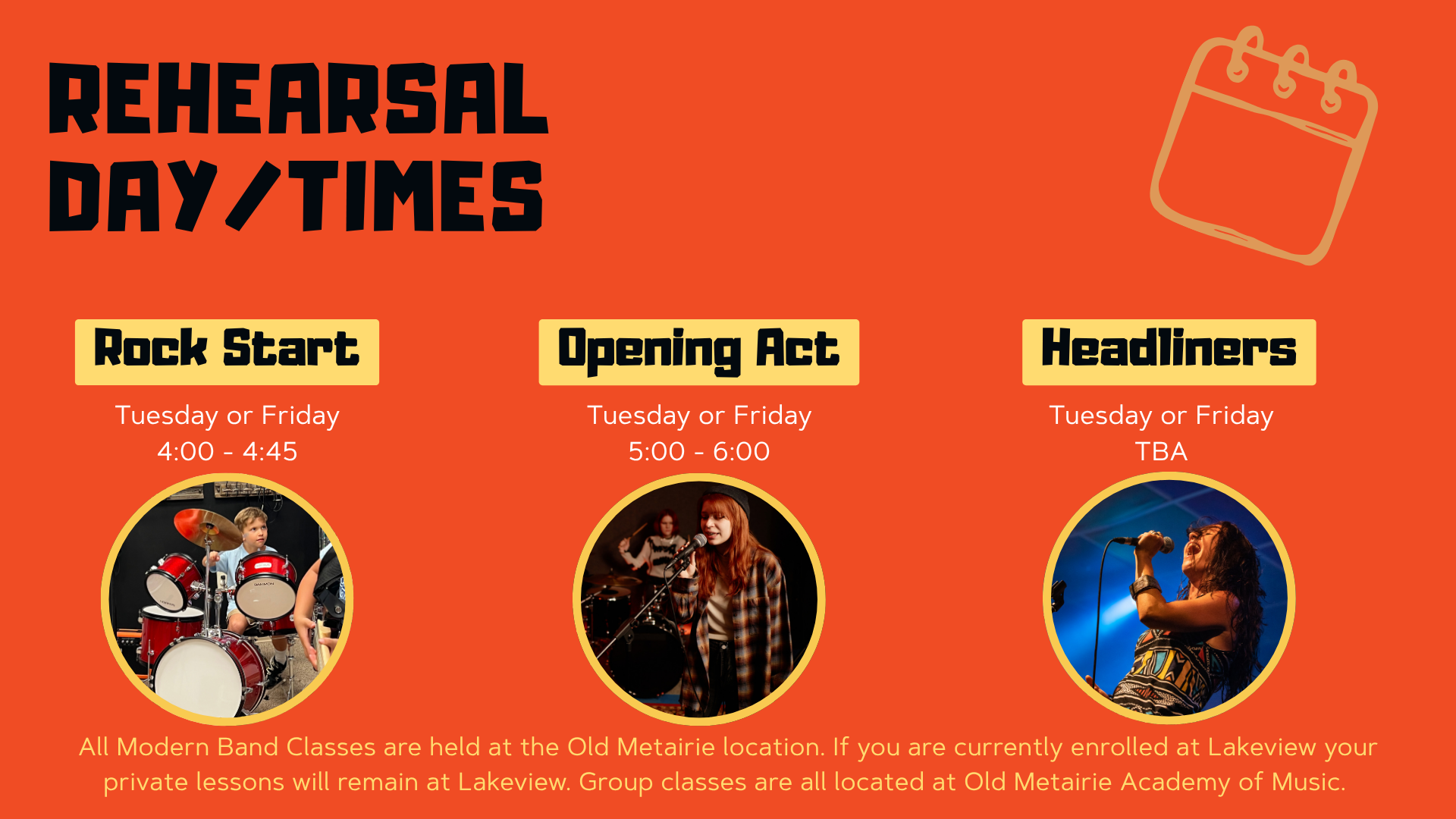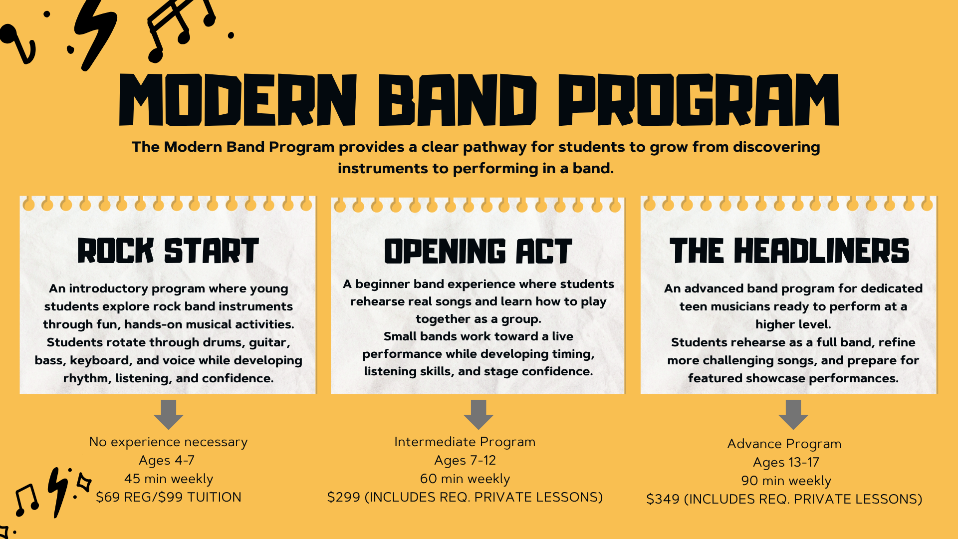 The Modern Band Program has 3 classes. Rock Start introduces young musicians to the exciting world of rock band instruments through fun, hands-on musical activities. Students explore drums, guitar, bass, keyboard, and voice while building confidence and curiosity about music.