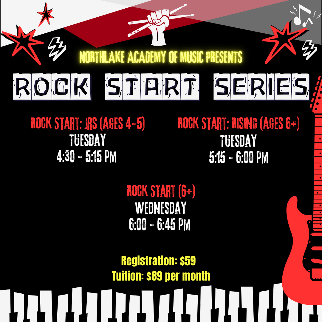 Our new weekly rock band class gives students ages 4–11 the chance to experience every instrument in the band—drums, guitar, bass, keyboard, and voice—using fun, age-appropriate techniques. Students will build musical skills through rhythm games, pitch activities, theory play, and hands-on learning with real instruments.